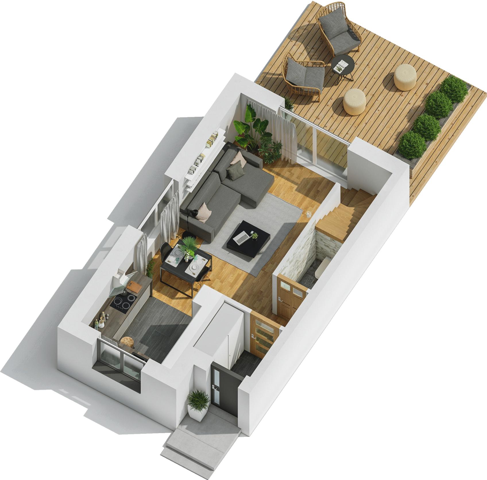 Na parterze, o powierzchni 33,07 m², znajduje się wiatrołap, WC, otwarta kuchnia z oknem oraz przestronny salon.