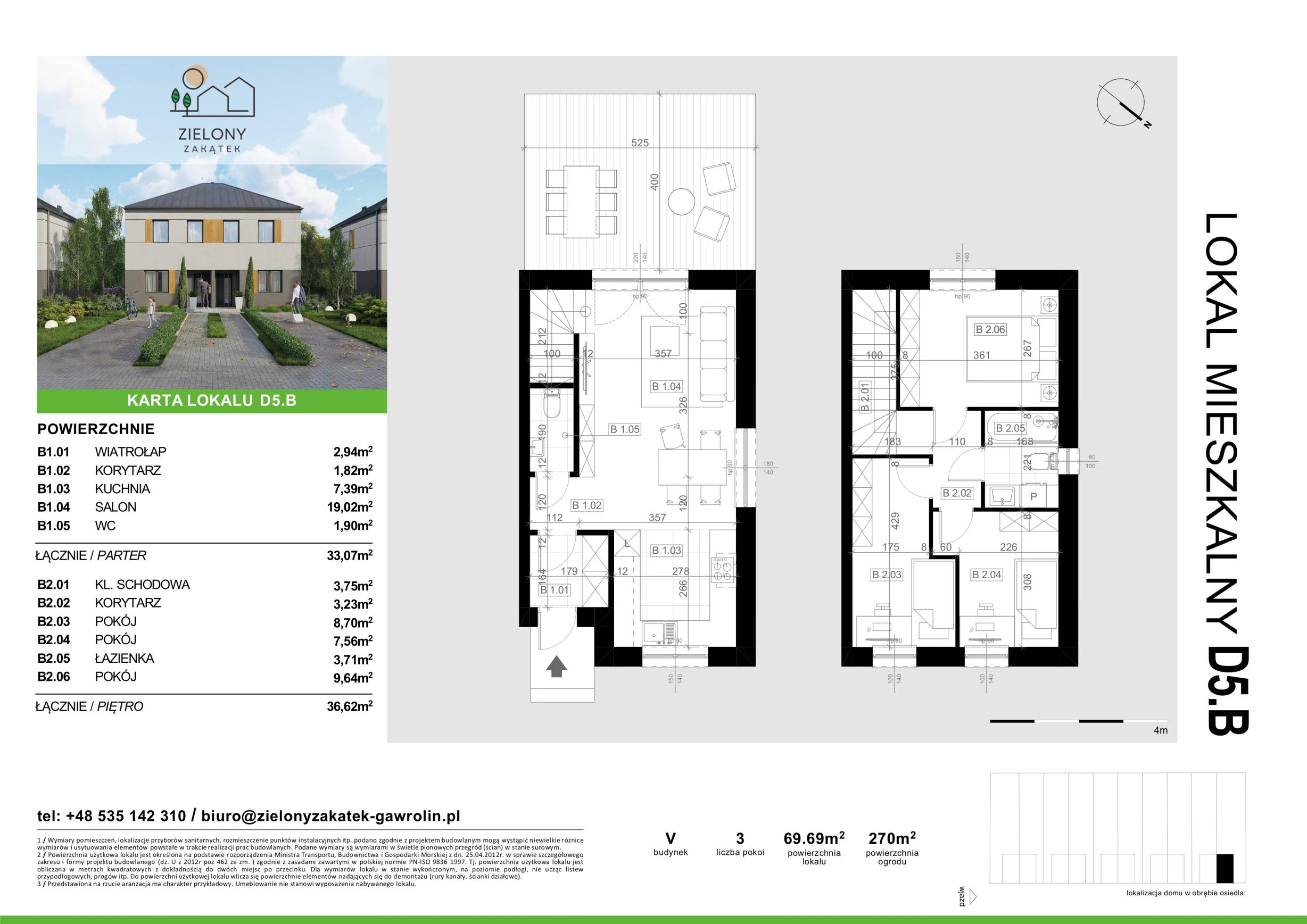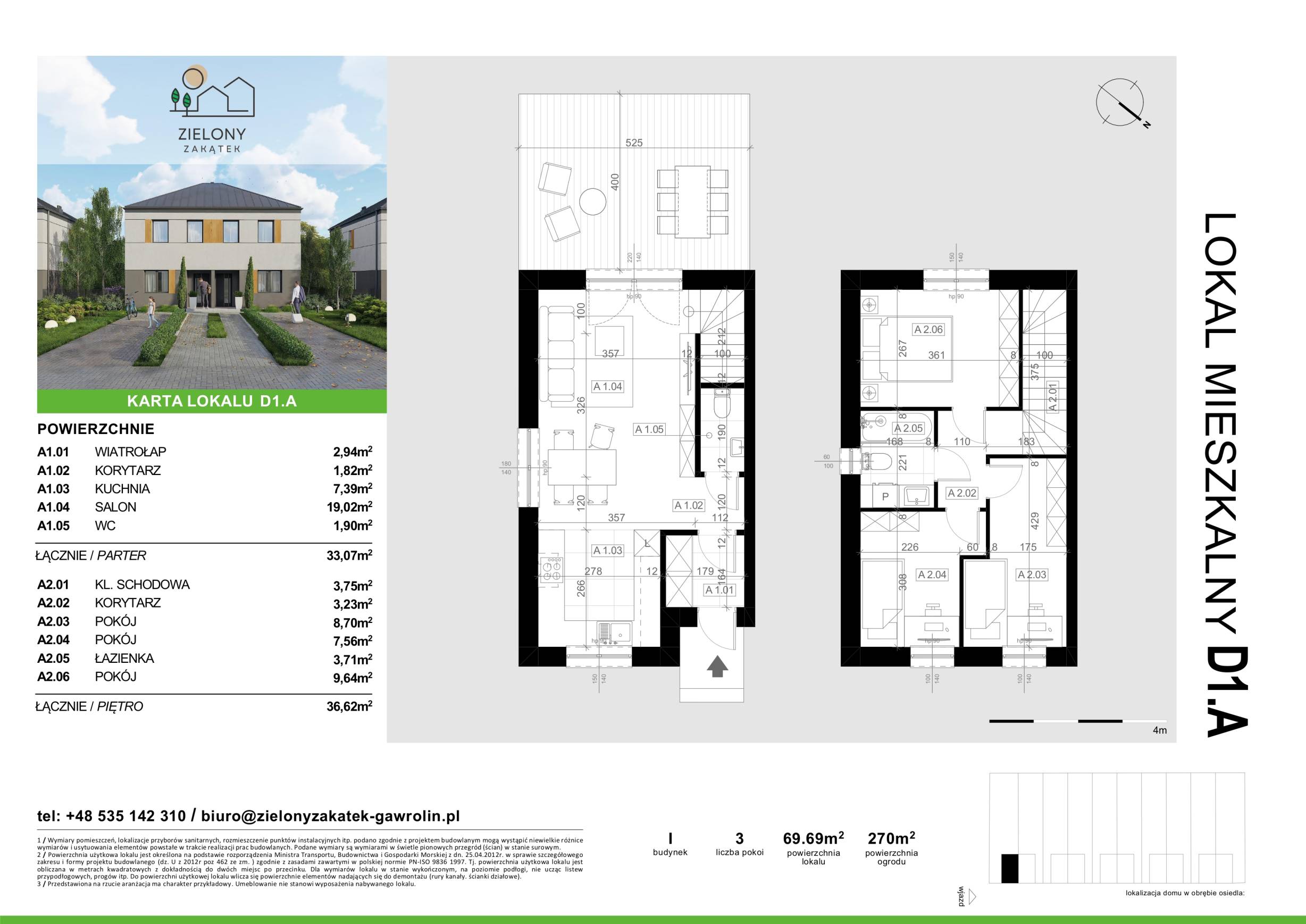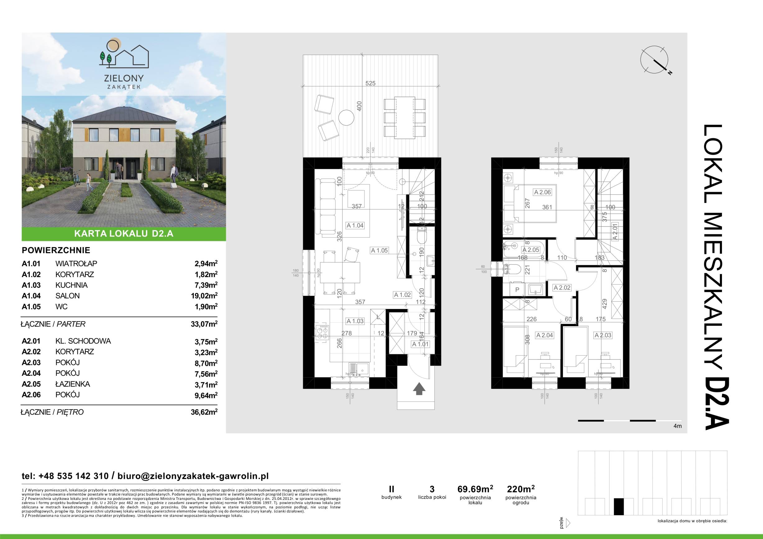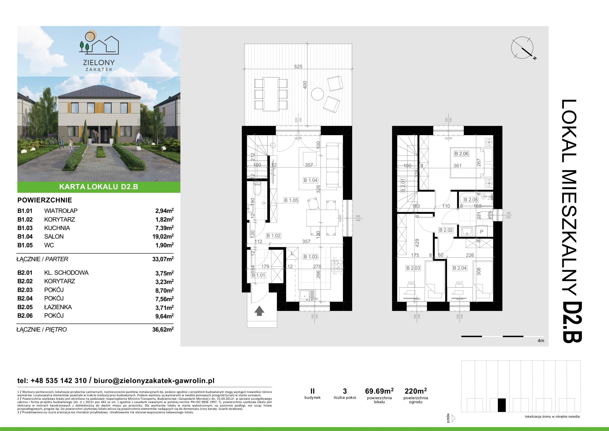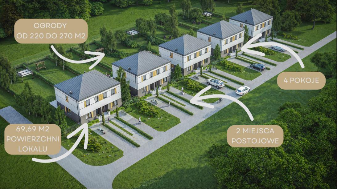 Każdy lokal oferuje przestrzeń 69,69 m² rozmieszczoną na dwóch piętrach. Do każdego z nich przynależy duży ogród o powierzchni od 220 do 270 m² oraz dwa miejsca postojowe.